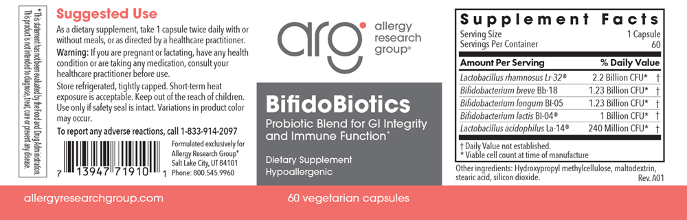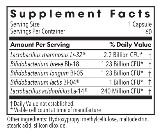 The bifidobacteria group are the most common probiotics found in the large intestine. They are comparatively delicate however, and their numbers can easily be depleted. Now with Bifidobacterium lactis! Lyophilized (freeze-dried). Non-Dairy and Gluten-free.