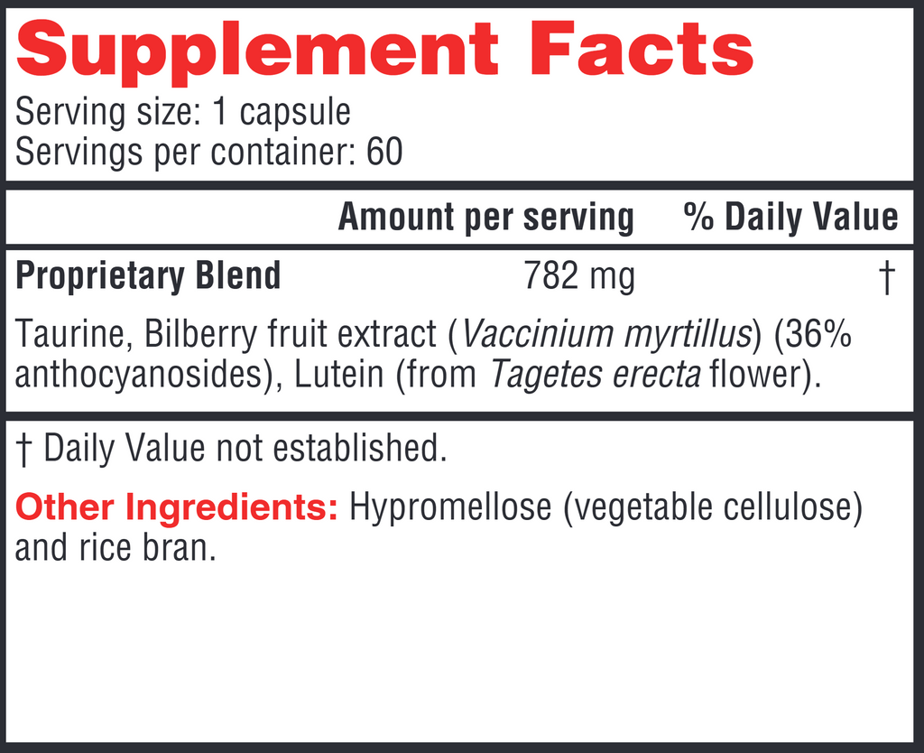 An antioxidant-rich nutraceutical formula containing taurine, bilberry, and lutein, to support healthy vision and blood circulation.