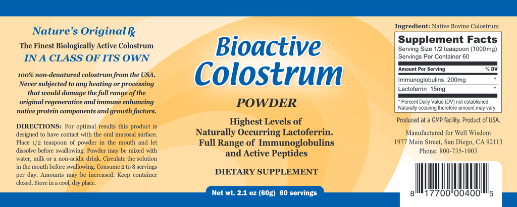 Bioactive Colostrum™ is a natural source of immune-boosting colostrum from grass-fed cows. Bioactive Colostrum™ is derived from cows that are grass fed on natural pastures. It is always GMO-free and never produced with genetically modified organisms. Bioactive Colostrum is Hormone-treatment-free, antibiotic-free, and BSE-free. Carefully created to maintain all original regenerative and immune enhancing native components, Bioactive Colostrum is minimally processed to avoid damaging the full range of the original proteins and active peptides found naturally in high-quality bovine colostrum.