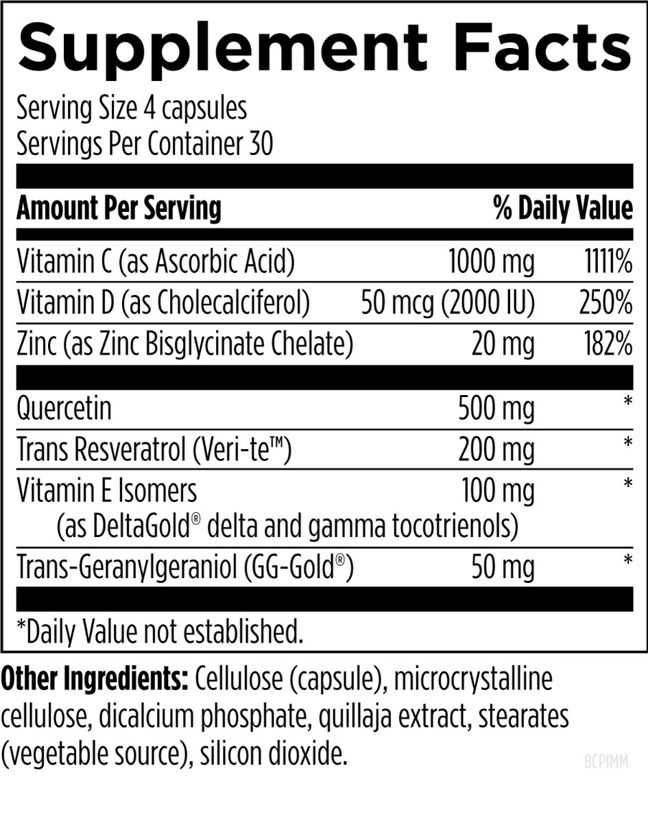 BioCap Immune™ is uniquely formulated to support antioxidative status and a healthy immune response.* Each 4-capsule serving provides 1,000 mg of vitamin C, along with clinically relevant amounts of the bioflavonoids quercetin and resveratrol (as Veri-Te™), 50 mcg (2,000 IU) of vitamin D, 100 mg of vitamin E isomers (as delta- and gamma-tocotrienols), 50 mg of geranylgeraniol (as GG-Gold®), and 20 mg of zinc.