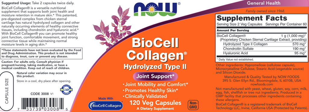 BioCell Collagen® is a versatile nutritional supplement that supports both joint health and moisture retention in mature skin. This patented, pre-digested complex from chicken sternal cartilage has natural hydrolyzed collagen and other naturally occurring elements of healthy connective tissues, including chondroitin and hyaluronic acid. With BioCell Collagen® you can promote healthy joint function, comfortable movement, and strong connective tissue while maintaining normal moisture levels in aging skin.