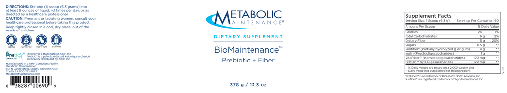 Description: The gut microbiome is an essential contributor to both gastrointestinal and general health. BioMaintenance™ Prebiotic + Fiber supplement is an excellent option for nourishing your healthy microbiome. In only 24 calories and 6 grams of total carbohydrates, this supplement is jam-packed with 5 grams of dietary fiber, isomaltooligosaccharides, xylooligosaccharides, and fructooligosaccharides. The synergistic effects of prebiotics and fiber in this product equal a wide array of benefits; including a greater sense of satiety, positive effects on glycemic response to support weight management, and factors that promote beneficial microflora in the gut. Gastrointestinal effects may include increased regularity, improved nutritional absorption, and gut cellular health support. A healthful microbiome also assists in balancing immune function and inflammation status.