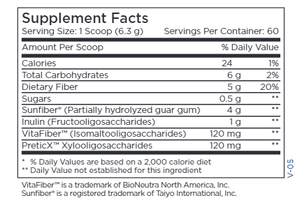 In only 24 calories and 6 grams of total carbohydrates, this supplement manages to deliver 5 grams of dietary fiber, isomaltooligosaccharides, xylooligosaccharides, and fructooligosaccharides. The synergistic effects of prebiotics and fiber are likely to include a greater sense of satiety, positive effects on glycemic response to support weight management, and factors that promote beneficial microflora in the gut. Gastrointestinal effects may include increased regularity, improved nutritional absorption, and gut cellular health support. A healthful microbiome also assists in balancing immune function and inflammation status.