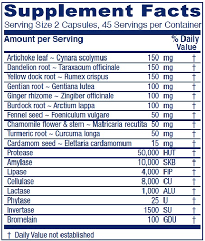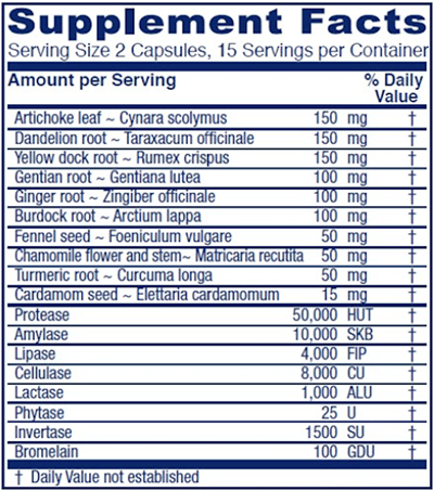 Traditional bitter herbs promote healthy digestion. Includes a full complement of plant-based digestive enzymes to support digestive functions more fully – in a convenient, easy to take capsule.*
