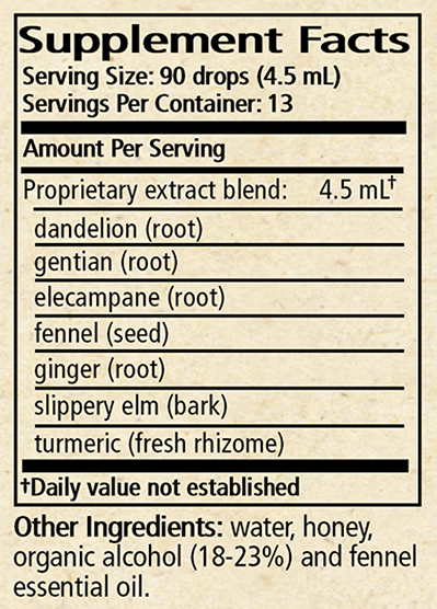 Ingredients: Dandelion root, gentian, elecampane, fennel, ginger, turmeric, slippery elm and fennel essential oil in a base of mountain spring water, honey and organic cane alcohol.