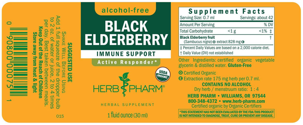 Herb Pharm prepares Black Elderberry Glycerite from the ripe berries of Certified Organic Sambucus nigra trees. The berries are hand-harvested only when ripe to assure optimal extraction of Black Elderberry’s bioactive compounds.