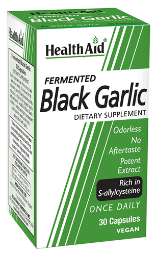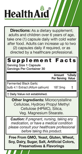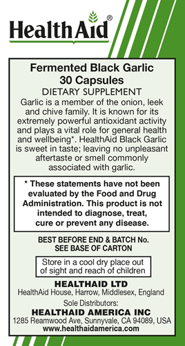 Black garlic’s unique color and benefits is achieved with no additives. It is normal white garlic which undergoes a controlled fermentation process resulting in an aged garlic that provides double the nutrients of white garlic. HealthAid® Black Garlic is richer in antioxidants and sweet in taste; leaving no unpleasant aftertaste or smell commonly associated with white garlic*.