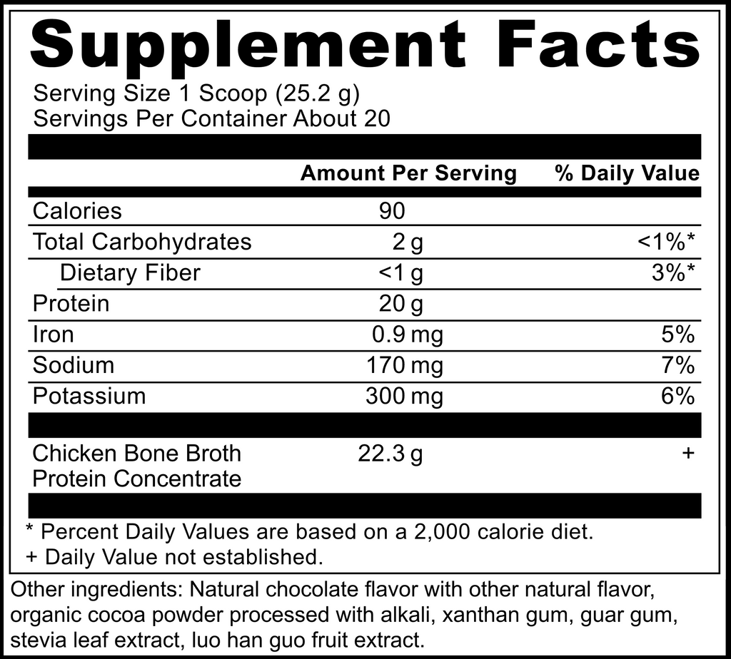 Bone Broth Protein Chocolate is a fitting new addition to your morning smoothie, coffee or favorite recipes. Featuring naturally occurring type II collagen, chondroitin, glucosamine, hyaluronic acid and a delicious flavor all under one lid; this fan-favorite delivers the benefits of traditional bone broth like joint, skin and gut support † in a sweet, feel-good flavor.