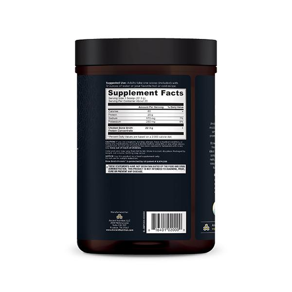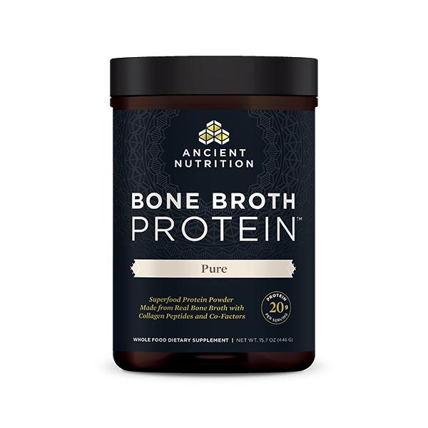 Our Bone Broth Protein’s classically flavored Pure is a savory staple for your cupboard. Ancient Nutrition Bone Broth Protein powder offers the inherent benefits of collagen type 2 (which, in turn, features glucosamine, chondroitin, hyaluronic acid) plus 19 amino acids all rolled up in our chicken-based line. This means gut, joint and skin support in a simple-to-mix, on-the-go, no-big-soup-pot-required powder rather than trying to stew true stock from the connective tissue and bone marrow of animals like our ancestors did.