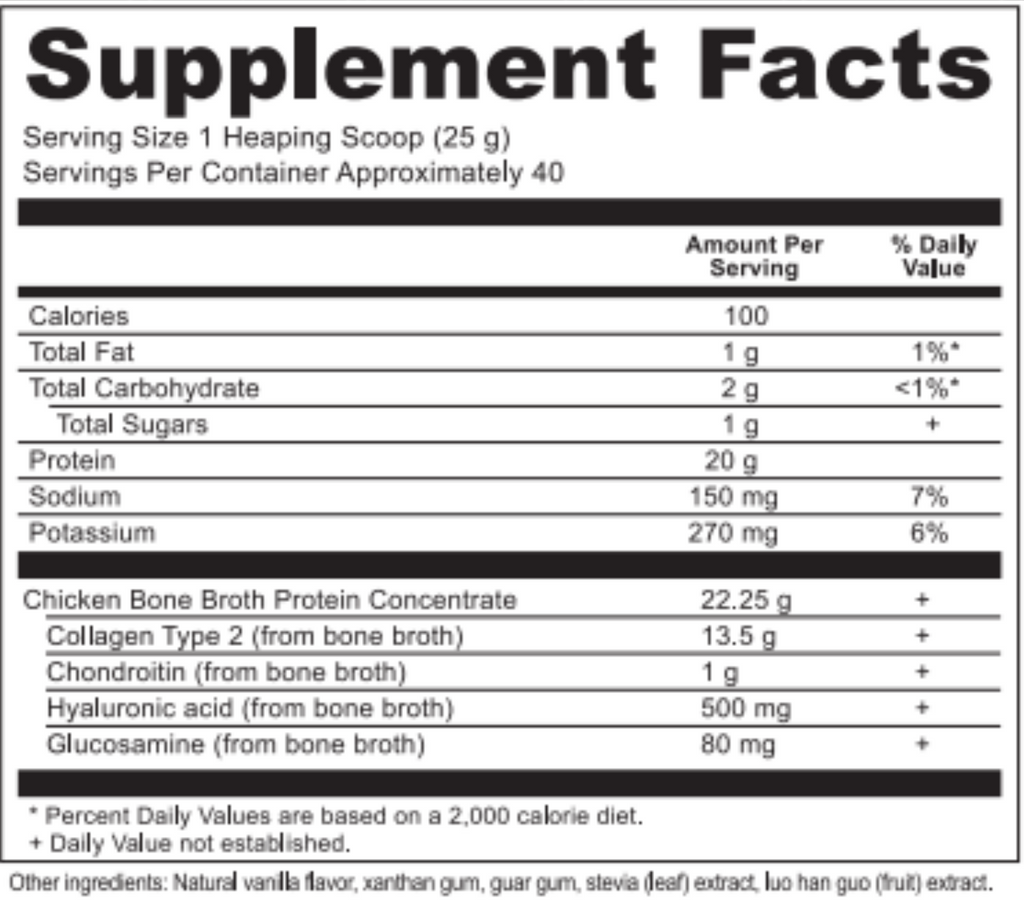 Bone Broth Protein Vanilla is a fitting new addition to your morning smoothie, coffee or favorite recipes. Featuring naturally occurring type 2 collagen, chondroitin, glucosamine, hyaluronic acid and a delicious flavor all under one lid; this fan-favorite delivers the benefits of traditional bone broth like joint, skin and gut support † in a sweet, feel-good flavor.