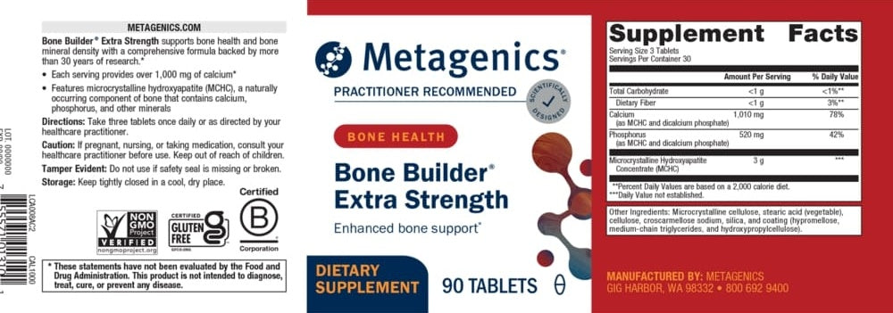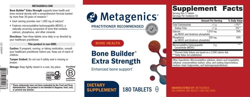 Bone Builder® Extra Strength provides bone health support with microcrystalline hydroxyapatite concentrate (MCHC), a highly absorbable crystalline compound comprised of naturally-occurring components of bone which is backed by over 30 years of research. MCHC contains naturally occurring calcium, phosphorus and trace amounts of other minerals, bone growth factors, and collagen and other vital bone proteins. Each serving of just three tablets provides over 1,000 mg of calcium.*
