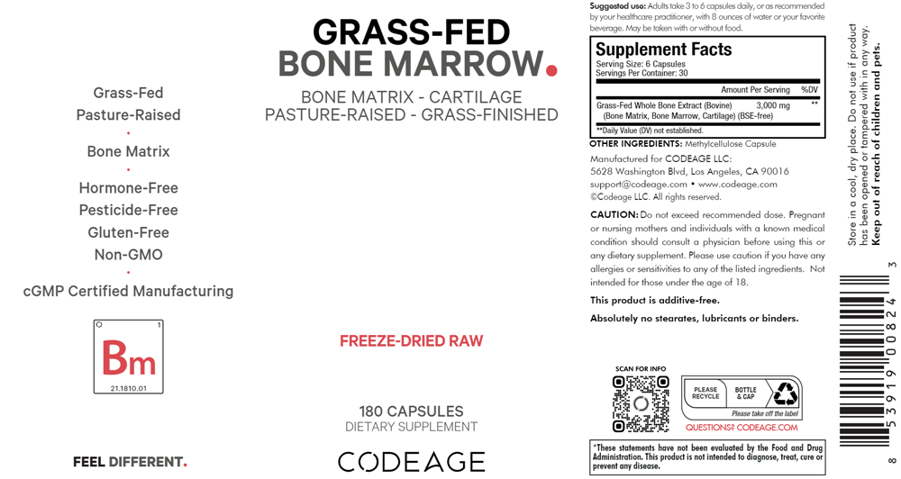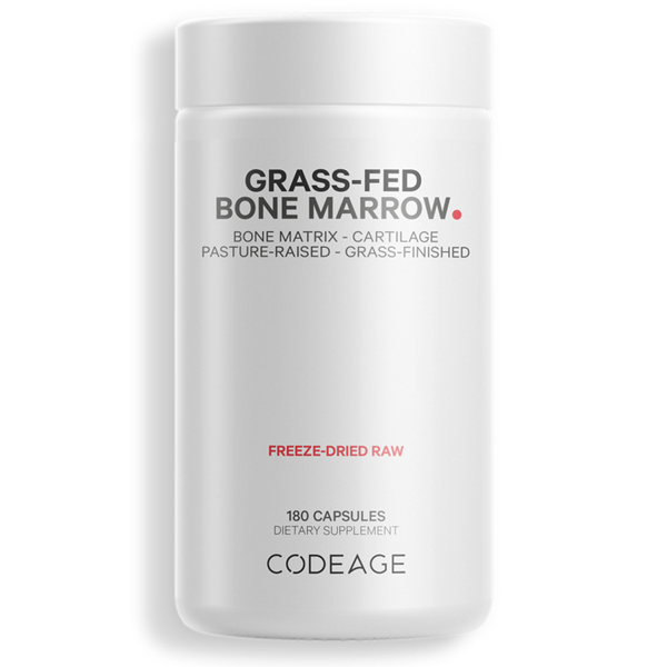 Codeage Grass-fed Bone Marrow supplements are freeze-dried, desiccated, and non-defatted. This formula provides 3,000 mg of grass-fed and pasture-raised bovine bone including, bone matrix, marrow, and cartilage per serving. Whole beef bone extracts can offer a source of specialized cells, collagen, growth factors, fat-soluble activators, trace minerals, and glycosaminoglycans.