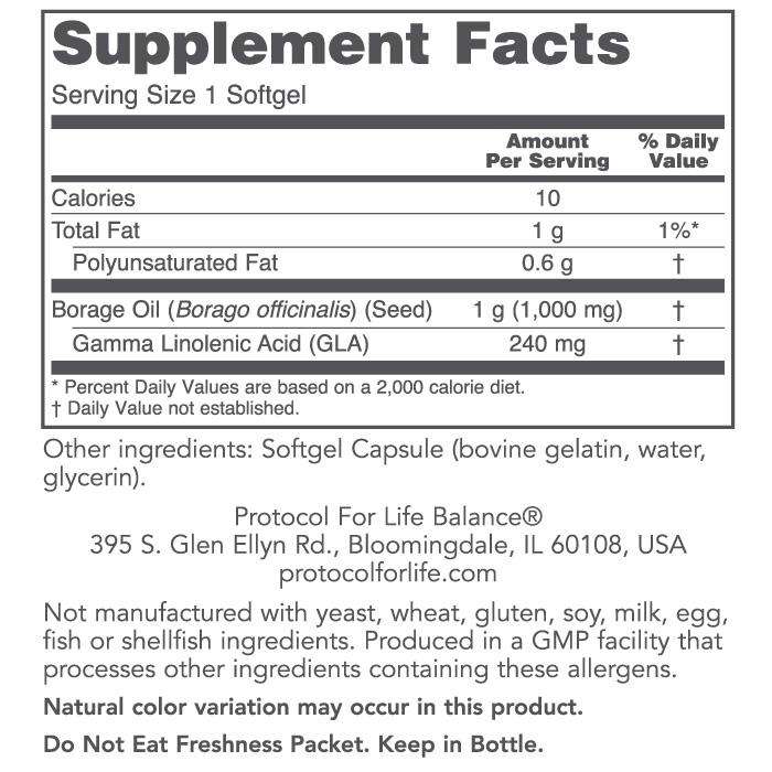 Gamma Linolenic Acid (GLA) is a fatty acid that is naturally found in Borage Oil. Although GLA can be produced in the body, it can be more easily utilized when supplied directly through dietary sources. Through its role in normal immune system function, GLA helps to maintain the integrity of the skin barrier and supports a healthy vascular system.* Furthermore, GLA has been shown to be important for lung, joint, and eye health.* Research has determined that Borage Oil does not contain harmful levels of Pyrrolizidine Alkaloids (PAs). The Borage Oil in this product is expeller-pressed and hexane-free.