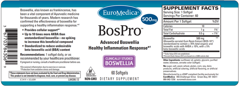 BosPro can help. It provides 500 mg of uniquely standardized boswellia, the clinically researched form used in studies around the world. BosPro contains a high-AKBA (acetyl-11-keto-beta-boswellic acid) form of boswellia. It’s different from other boswellia extracts, which can have as little as 1% of this beneficial compound. It is also purified to screen out beta-boswellic acid to less than 5%, as this compound can actually promote inflammation. It is a truly effective choice.