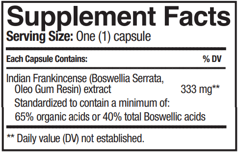 Mechanism of action: Animal studies performed in India show that BSE (Boswellia Serrata Extract) decreased polymorphonuclear leukocyte infiltration and migration, decreased antibody synthesis and caused almost total inhibition of classical complement pathway. Recently, BSE has been shown to inhibit 5-lipoxygenase and also human leukocyte elastase and as a result has been recommended for various inflammatory conditions. The mechanism of action is quite distinct from non-steroidal anti-inflammatory drugs (NSAIDS) which inhibit prostaglandin synthesis.