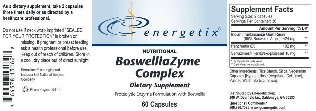 BoswelliaZyme Complex helps support normal immune response in the body. This nutritional supplement formulated with boswellia and the proteolytic enzymes, serrapeptase and pancreatin extract, also helps support normal cartilage and joint function and maintains the body’s natural response to injury.