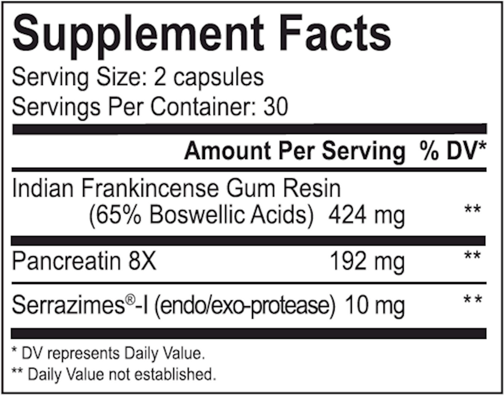 Indian Frankincense (Boswellia serrata) Gum Resin (65% Boswellic Acids), Pancreatin 8X, Serrazimes®-I (endo/exo-protease).