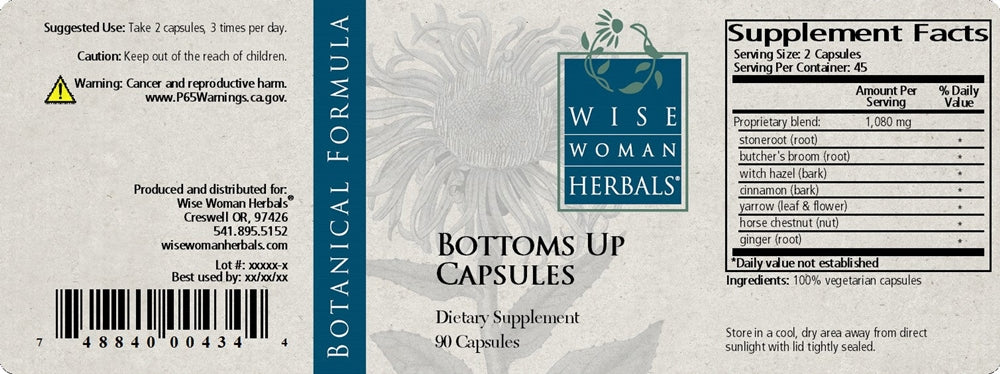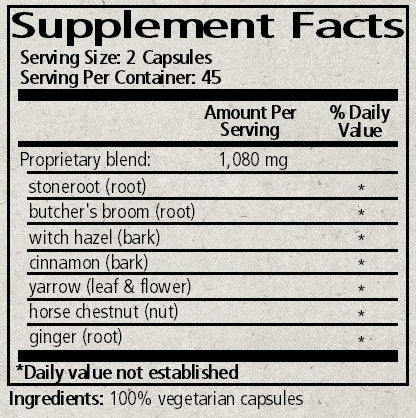 Ingredients: stoneroot, butcher's broom, witch hazel, cinnamon, yarrow, horse chestnut and ginger in 100% vegetarian capsules