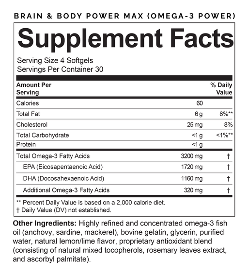 Omega-3 Power is a highly potent source of omega-3 fatty acids EPA and DHA, cell membrane nutrients that have numerous health benefits at every stage of life. This supplement is intensively concentrated from fish oils, then purified and exhaustively tested to screen out 250+ environmental contaminants. When used at the very high doses recommended in Brain & Body Power Max, this supplement supports brain, heart, bone and immune health, as well as total wellbeing.