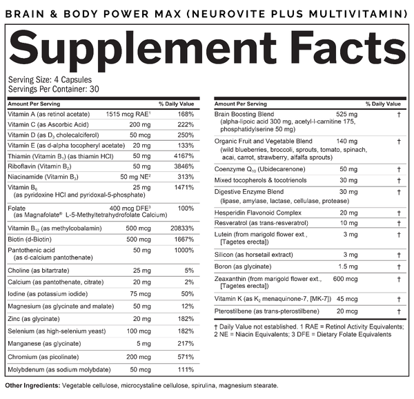 NeuroVite Plus is a uniquely diversified supplement that includes more than 50 clinically proven ingredients to help you look your best, feel your best, and think your best. Unlike most typical multivitamins, it is enhanced with multiple food concentrates as well as nutrients that specifically promote mental performance and vision. Its Fruit and Vegetable Blend supplies a variety of additional flavonoids and other food-source antioxidants.