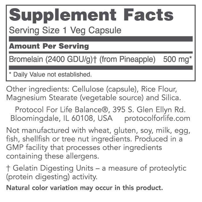 Bromelain is a proteolytic (protein-digesting) enzyme derived from the pineapple plant. It is functional throughout a wide pH range and does not lose its activity as it goes through the acidic environment of the stomach. Scientific studies indicate that Bromelain is highly bioavailable and may help to alleviate normal transient pain and discomfort associated with occasional overuse. This product has 500 mg of natural Bromelain per capsule and is suitable for vegetarians.
