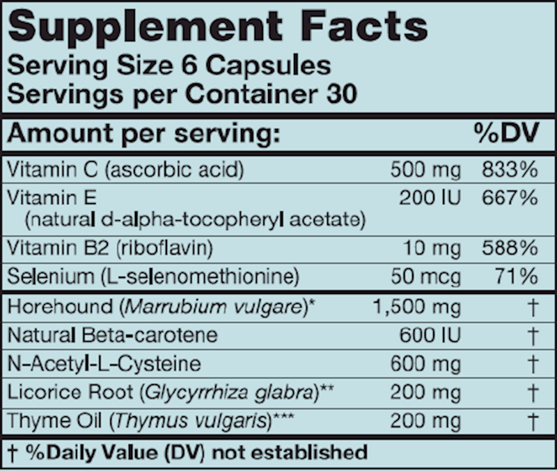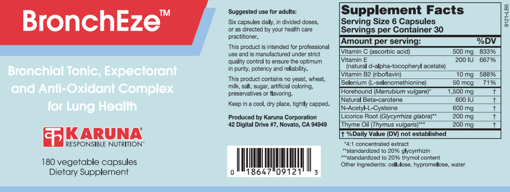 Protection against oxidative stress is crucial in lower respiratory tissues involved in oxygen exchange. N-acetylcysteine (NAC) is a precursor of the antioxidant glutathione, and is effective for supporting the bronchopulmonary tissues and supporting general well-being. BronchEze includes additional classic antioxidant support nutrients such as vitamins C and E, carotene, riboflavin, and selenium, many of which may be insufficient in Western diets. These nutrients also help maintain optimal immune system function. Horehound and licorice extracts, and thyme oil, are traditional botanicals and tonics for lung support.*