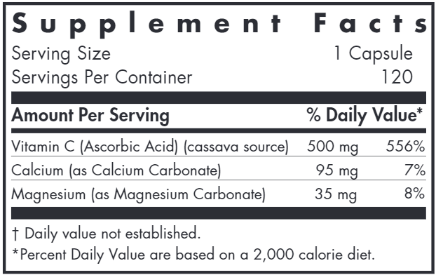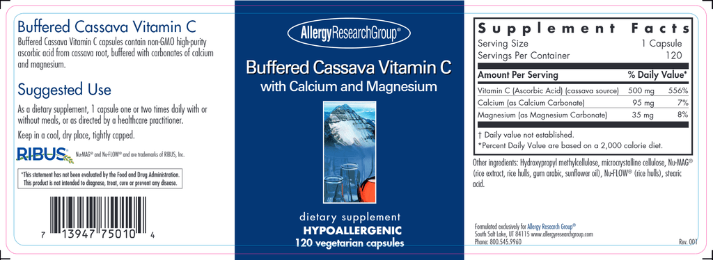 Buffered Cassava Vitamin C capsules contains high-purity non-GMO ascorbic acid from cassava root, buffered with carbonates of calcium and magnesium.
