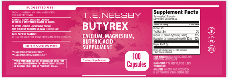 Butyrex® from T.E. Neesby, along with a good diet, is a beneficial dietary supplement in promoting overall wellness. It is especially helpful for maintaining a healthy gastrointestinal system.*