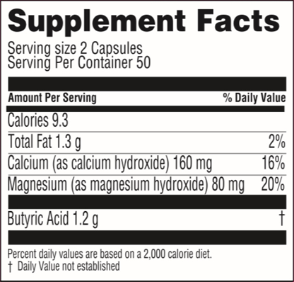Each capsule contains at least 600 mg butyric acid as calcium/magnesium butyrates. Micro-encapsulated design delivers butyrate to the colon without breaking down in the intestinal tract.