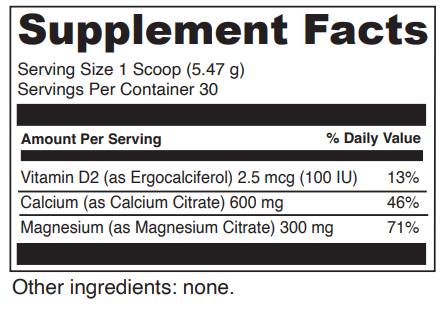 A Vegetarian Calcium/Magnesium/D2 Supplement to support bone function.* We combine a 2:1 ratio of elemental calcium to magnesium in the citrate form along with Vitamin D to enhance absorption. Calcium citrate is easy to absorb allowing a high percentage of elemental calcium and magnesium to be utilized by the body. Calcium and Magnesium are important for neurological and nervous system development, but also help with calming and relaxation, which makes it great for right before bed time.* This convenient tasteless powder makes it easy to administer and can be mixed in cold drinks or soft foods.