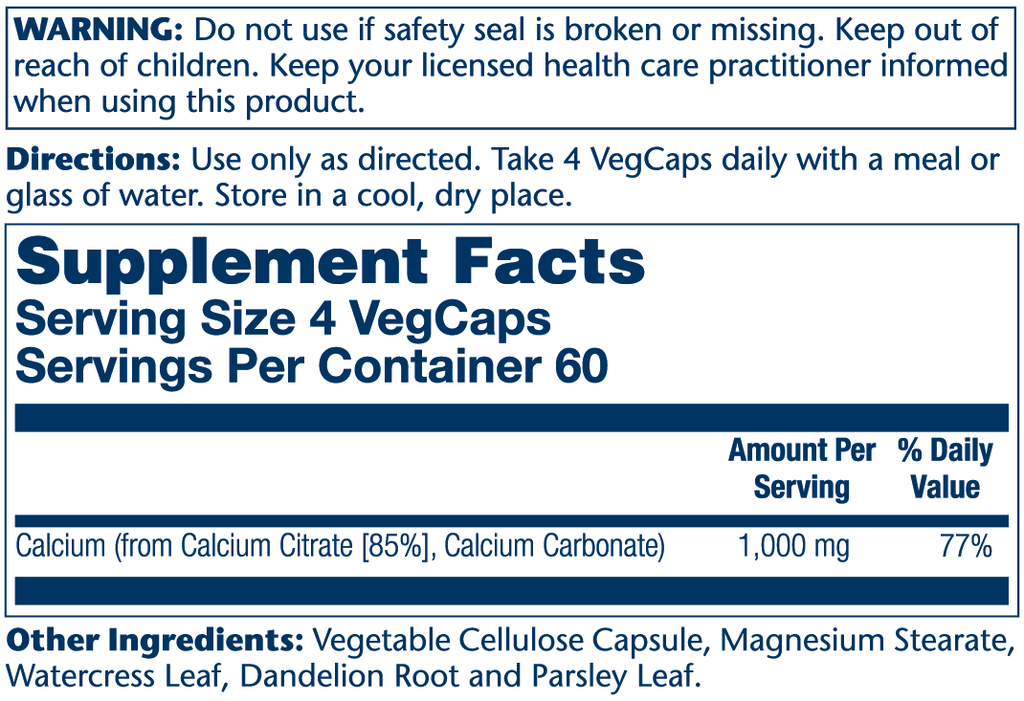 Calcium is intended to support healthy bones and teeth. The calcium in this product is bonded with natural citric acid and is specially formulated for people with low stomach acid. A special base of herbs has also been included for additional nutritive support.