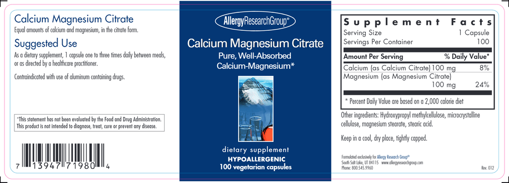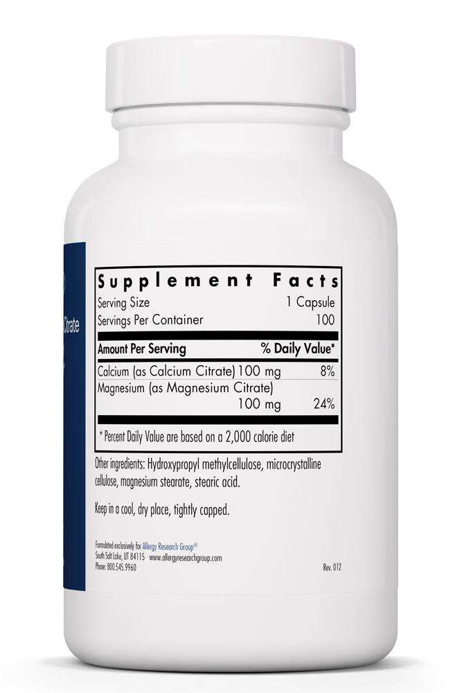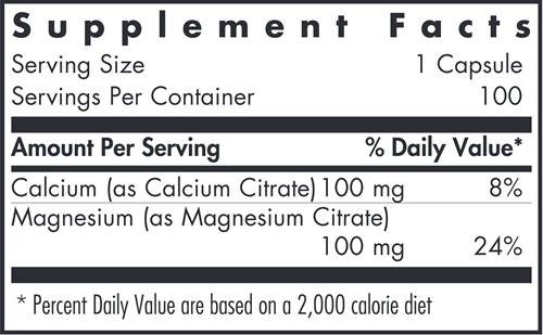Equal amounts of calcium and magnesium, in the well-absorbed citrate form.* Each capsule contains 100 mg of calcium and 100 mg of magnesium in a 1:1 ratio.