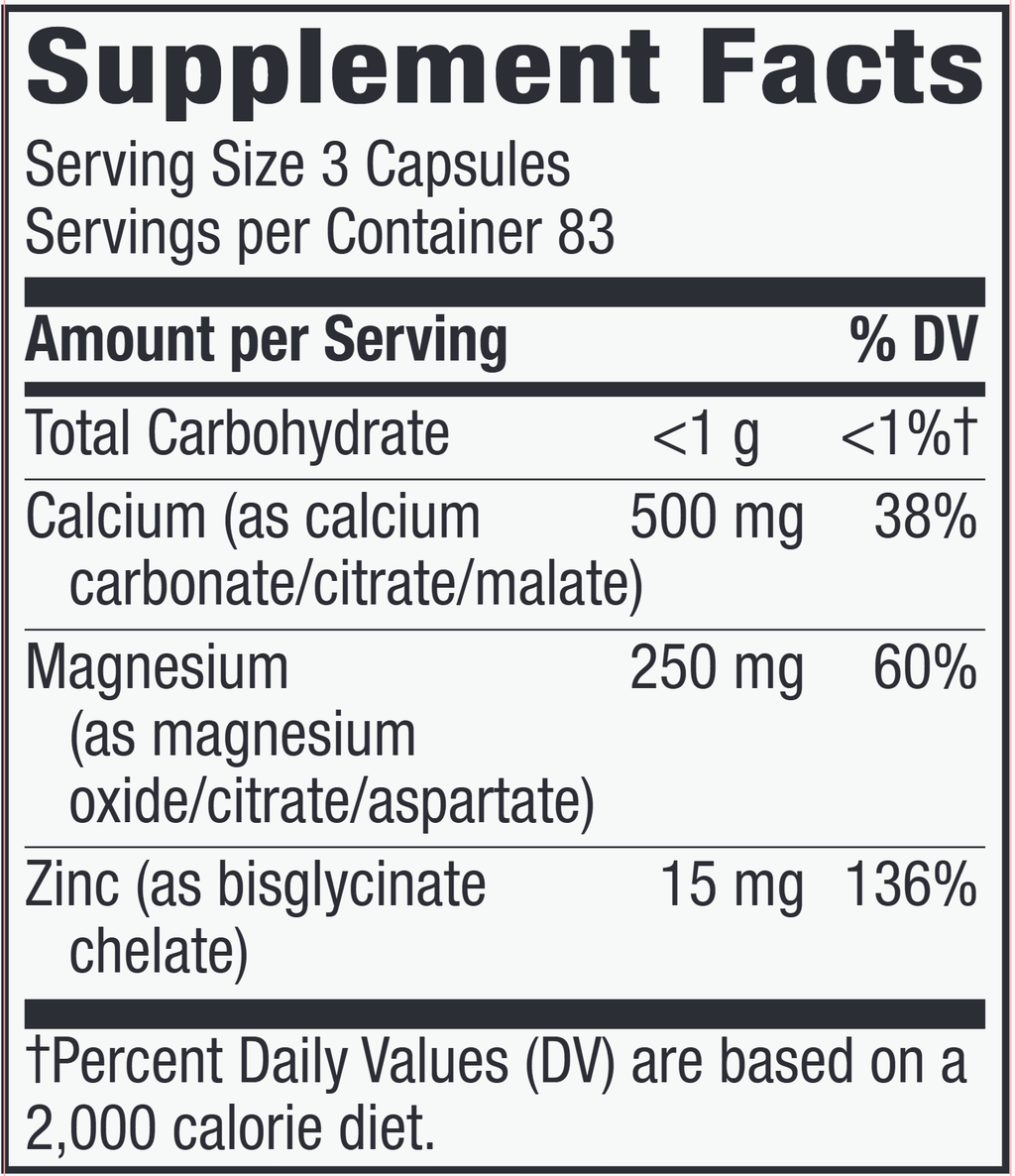 It’s a simple way to support the body systems that keep you moving. Calcium and magnesium are essential for healthy bones, teeth, and muscle function.* Zinc is essential for cellular reproduction, which is the process of growth and repair.* Together, these three important nutrients are a dream team for helping you feel your best.