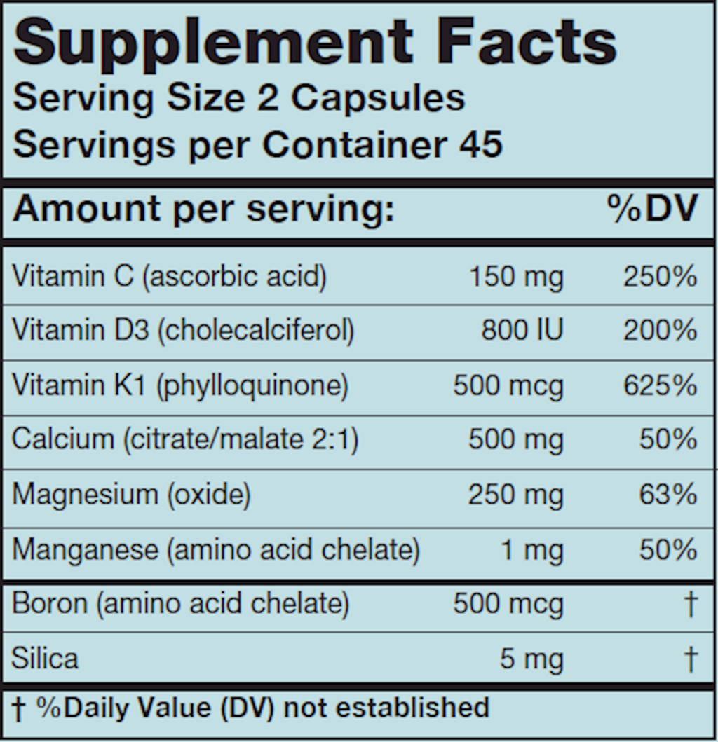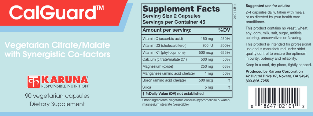 CalGuard provides well-absorbed vegetarian calcium from a citrate-malate source, balanced with magnesium and other bone-building nutrients. A generous amount of vitamin K is included, and vitamin D is supplied in the preferred D3 form for maximum bioavailability. These nutrients, along with vitamin C and manganese, work together to support optimal bone density and help skeletal structures maintain their integrity.*
