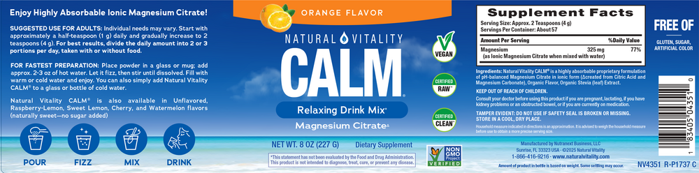 When life gets overwhelming, turn to a simple ritual with real ingredients. Natural Vitality CALM® Orange drink mix delivers 325 mg of magnesium as highly absorbable ionic magnesium citrate to help find your calm.† Just mix, sip, and relax.