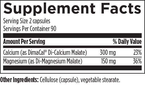 Cal/Mag 2:1 offers calcium and magnesium in a 2:1 ratio: 300 mg calcium and 150 mg magnesium per 2-capsule serving. The body’s requirement for calcium is higher than that for magnesium, but compared to magnesium, calcium is relatively abundant in the food supply, particularly for people whose diets include dairy products.