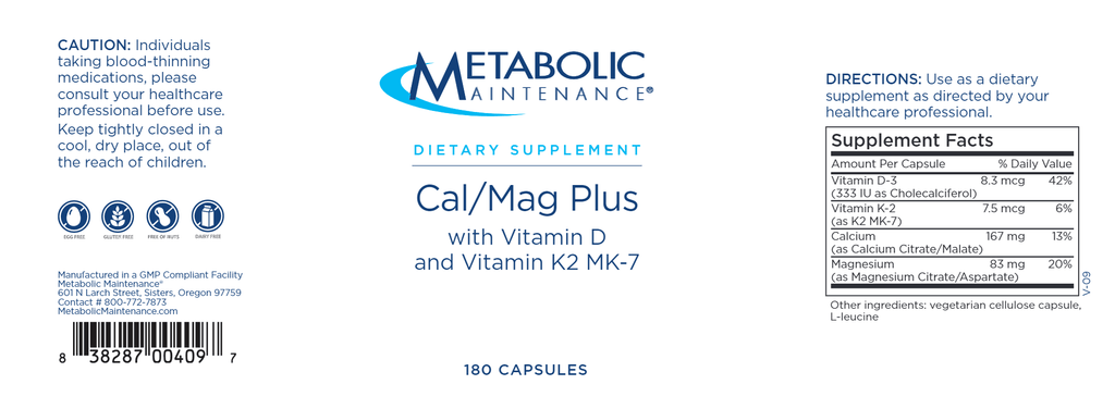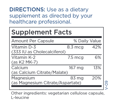Cal/Mag Plus with Vitamin D and K-2 M7 is designed to support bone health, cardiovascular health, nerve signaling, and muscle function. Calcium is provided in its highly bioavailable citrate/malate form and magnesium is provided as magnesium citrate/aspartate. Vitamins D-3 and K-2 have been included to maximize the efficiency of calcium absorption and utilization.
