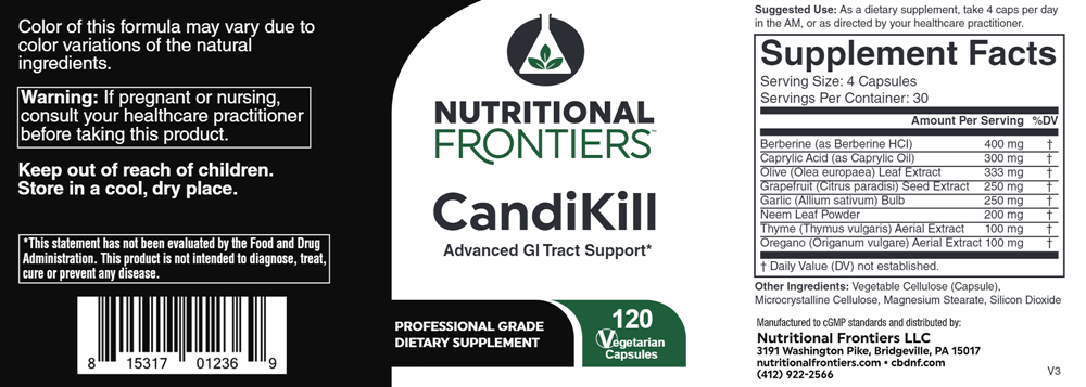 CandiKill is formulated to target Candida albicans and other fungal infections. Candida infections can produce various symptoms depending on the area of infection. Once you and your healthcare practitioner have determined that you are suffering from a candida infection, CandiKill can play an important role in reducing this type of infection. Dietary changes are also crucial in reversing Candida overgrowth, which your doctor will discuss with you. It is usually suggested that one take a good quality probiotic while trying to eradicate Candida, such as SBC by Nutritional Frontiers.