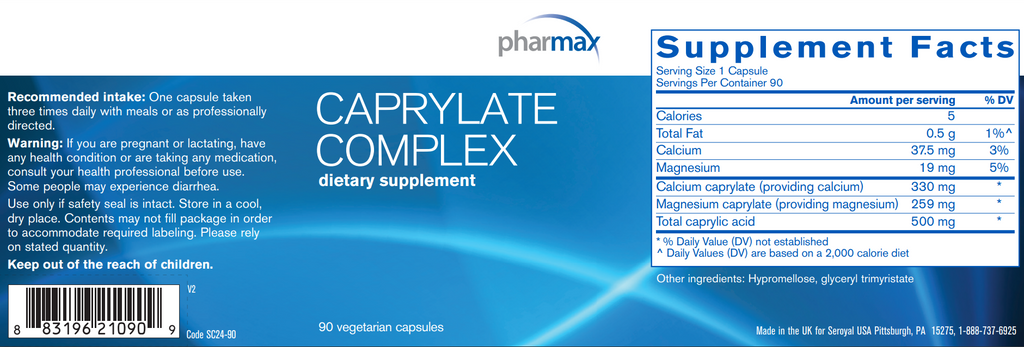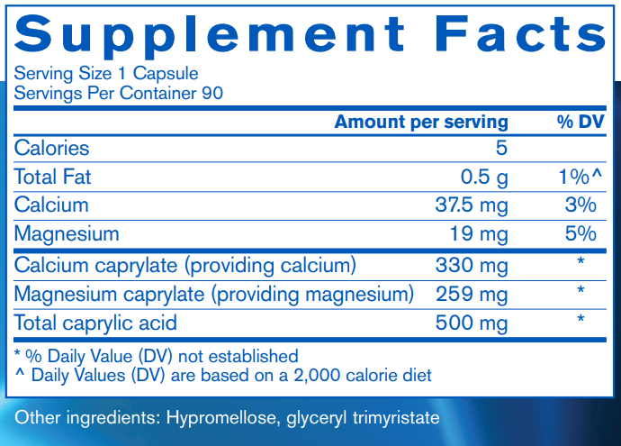 Caprylate Complex contains 500 mg of caprylic acid, 50 mg of calcium, and 20 mg of magnesium per capsule. Caprylic acid may promote a healthy microflora balance, while maintaining the body’s existing population of beneficial intestinal bacteria.