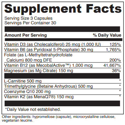This formula provides a comprehensive cardiovascular strategy by providing nutrients to support healthy cardiac tissue, vascular integrity, and homocysteine levels, while also providing nutrient replenishment to those patients taking cardiovascular medications.*