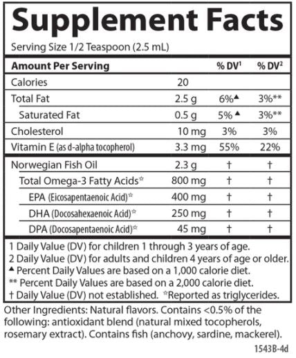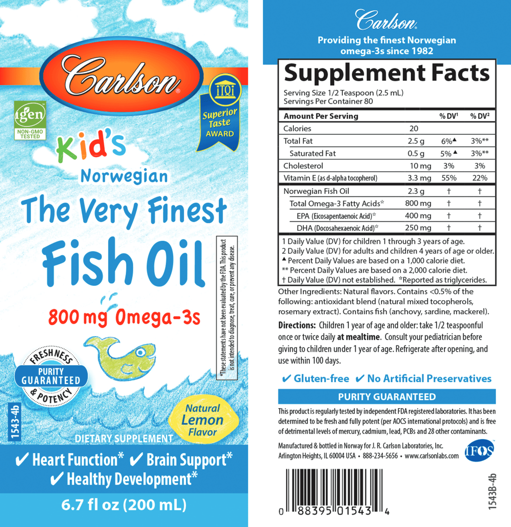 Kid's Norwegian The Very Finest Fish Oil has received numerous awards for its taste and quality. To ensure maximum freshness, Kid's The Very Finest Fish Oil is closely managed from sea to store. We source the highest quality, deep, cold-water fish using traditional, sustainable methods. Kid's The Very Finest Fish Oil is then bottled with a touch of antioxidants and is given a nitrogen flush to remove oxygen and help prevent oxidation. Each 1/2 teaspoon of Kid's The Very Finest Fish Oil provides 800 mg of omega-3s, including EPA and DHA, which support heart, brain, vision, and joint health. Like all Carlson omega-3s freshness, potency, and purity are guaranteed.