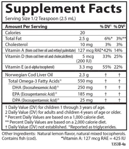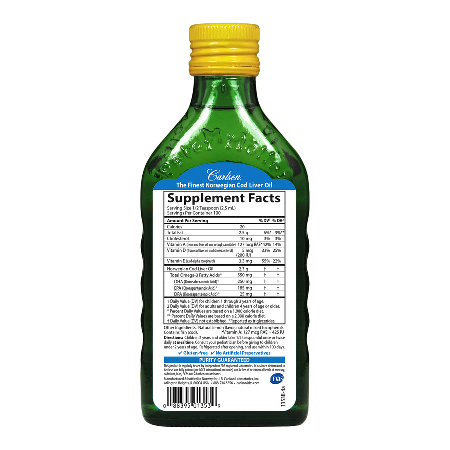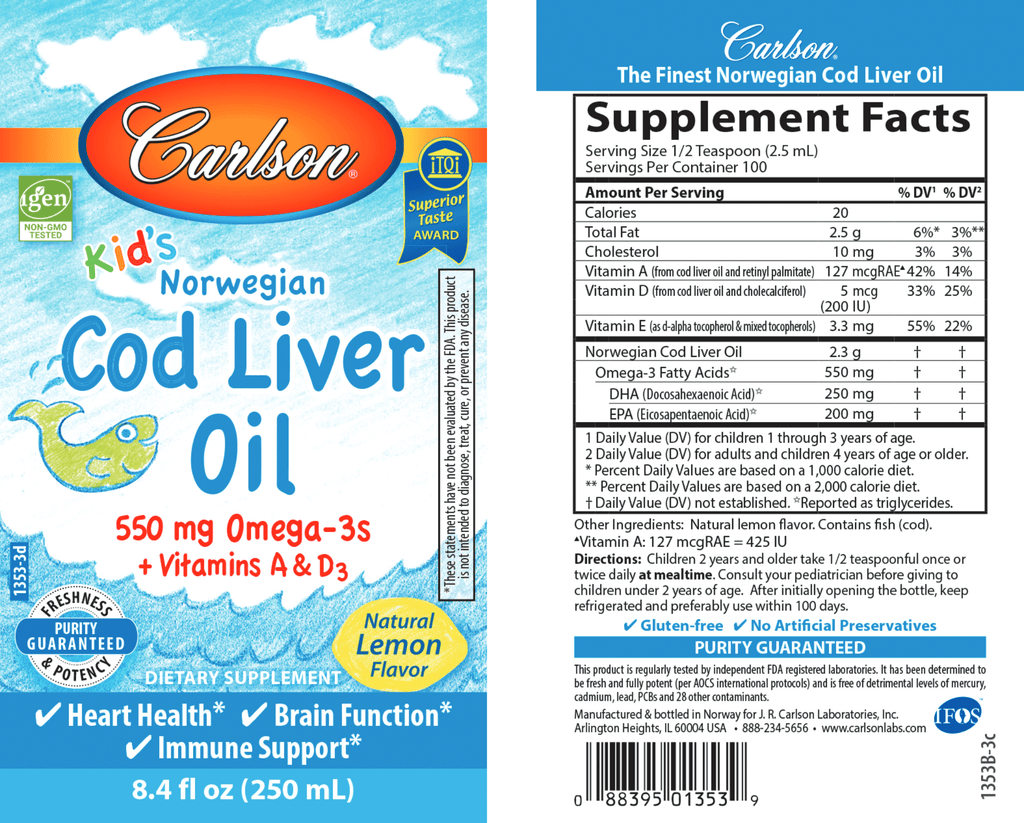 Carlson for Kids Norwegian Cod Liver Oil has received numerous awards for its taste and quality. A single 1/2 teaspoonful provides 550 mg of omega-3s, including EPA and DHA, which support heart, brain, and immune system health. To ensure maximum freshness, Kid's Cod Liver Oil is closely managed from sea to store.