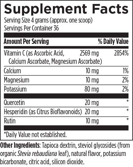 This delicious, effervescent, orange-flavored powder easily provides targeted dosing of vitamin C. Potassium bicarbonate is included in this formula as a buffering agent and to give it “fizz.“ Also included are quercetin, hesperidin, and rutin, which are natural bioflavonoids commonly found in citrus fruits.