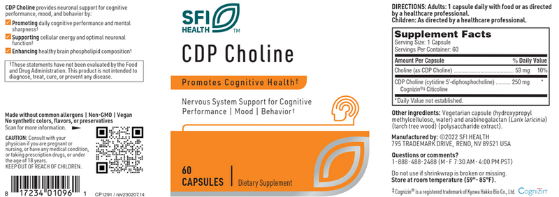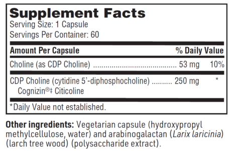 CDP Choline, also known as citicoline or cytidine diphosphate choline, is a precursor of phosphatidylcholine, glycerophosphatidylcholine, and acetylcholine. It is the product of the rate-limiting step of acetylcholine synthesis. Citicoline has well-documented neuroprotective effects.† It increases glutathione synthesis, augments glutathione reductase activity, and maintains mitochondrial cardiolipin levels.† Citicoline supports memory, attention, and focus.†