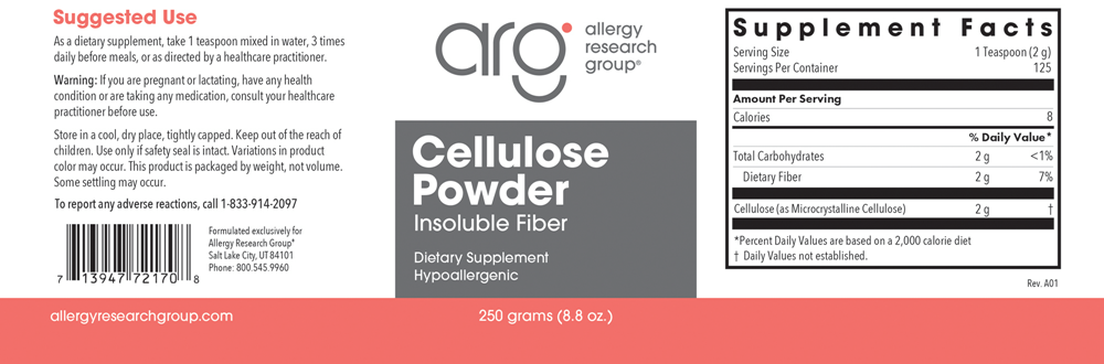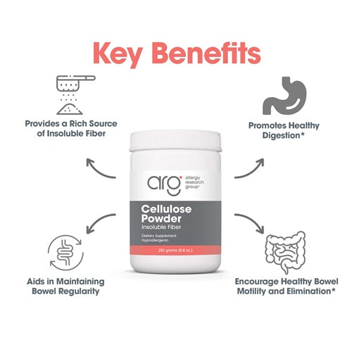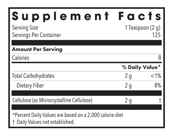 Cellulose is an excellent source of insoluble fiber, which can support bowel function.* Unlike soluble fiber, insoluble fiber is not readily fermented into short chain fatty acids, and has no effect on cholesterol levels.* Insoluble fiber does not feed undesirable bacteria.*