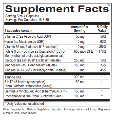 Phosphatidylserine: Phosphatidylserine (PS) is a phospholipid found in high concentrations in the brain. Phosphatidylserine has been shown to play a role in regulating cortisol excretion. Elevated levels of cortisol throughout the night can contribute to frequent waking. When taken in the evening, PS can help reduce cortisol excretion from the body’s stress response system, the hypothalamic-pituitaryadrenal (HPA) axis, in order to promote a healthy sleep cycle.