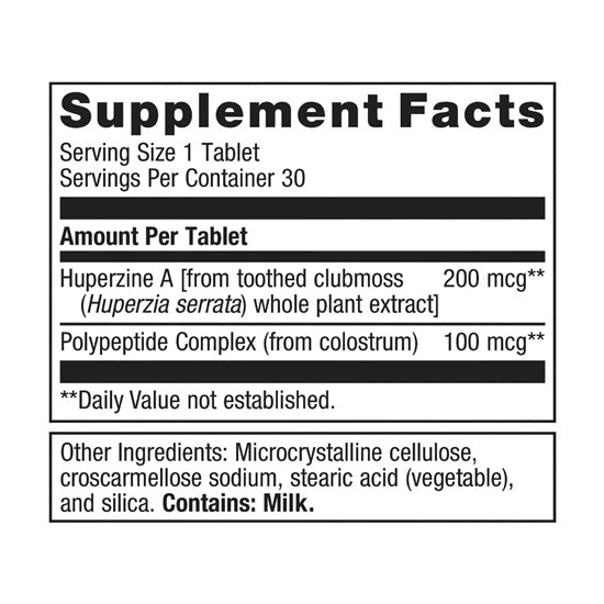 Caution: For adult use only. Avoid use if taking acetylcholinesterase inhibitors or cholinergic medications, or if you have a seizure disorder, cardiac arrhythmia, benign prostatic hypertrophy, asthma, chronic respiratory condition, peptic ulcer, inflammatory bowel disease, or malabsorption syndrome. If you have suppressed immune function or are taking medication, including blood thinning medications and immunomodulators, consult your healthcare practitioner before use. Rare but mild and temporary anxiety, mood change, sleep disturbance, dizziness, or fatigue may be experienced. Do not exceed two tablets daily. Use with caution when driving or operating machinery. Keep out of the reach of children.