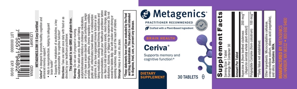 Ceriva® is formulated to support healthy cognition and memory by beneficially modulating the metabolism of the neurotransmitter acetylcholine and aiding neuroprotection.*