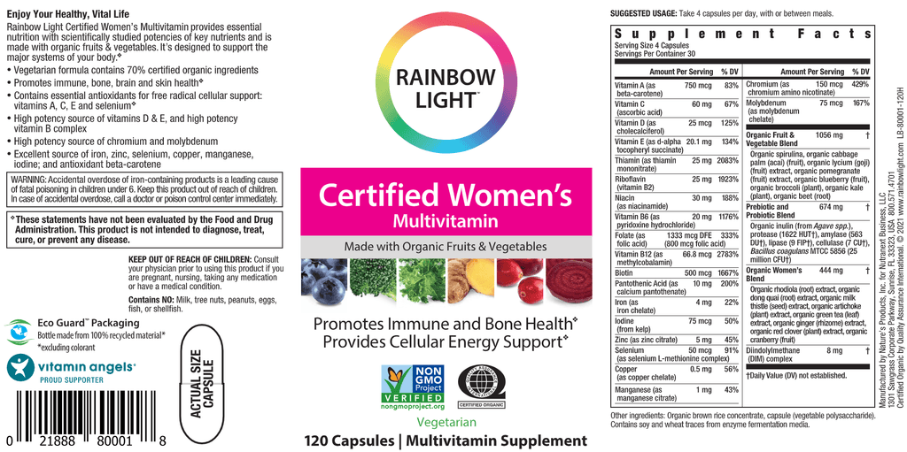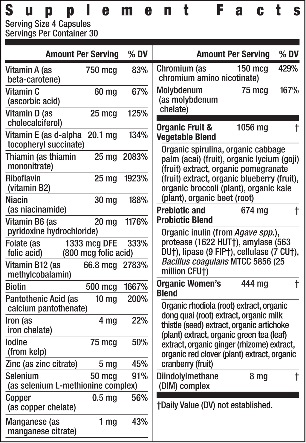 For natural, steady energy to get you through your day, and nutritional support to ease stress, Certified Women’s Multivitamin includes whole foods, a comprehensive B-vitamin complex and an Organic Strength & Energy Blend with green tea, rhodiola, mountain cranberry, and red clover.*