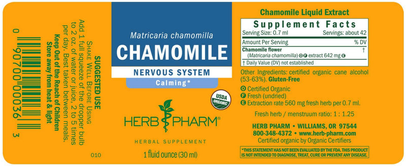 Herb Pharm prepares Chamomile extract from the flower of Certified Organic Matricaria chamomilla plants grown on farms in southern Oregon. Chamomile is hand-harvested in the late spring and extracted fresh the same day.